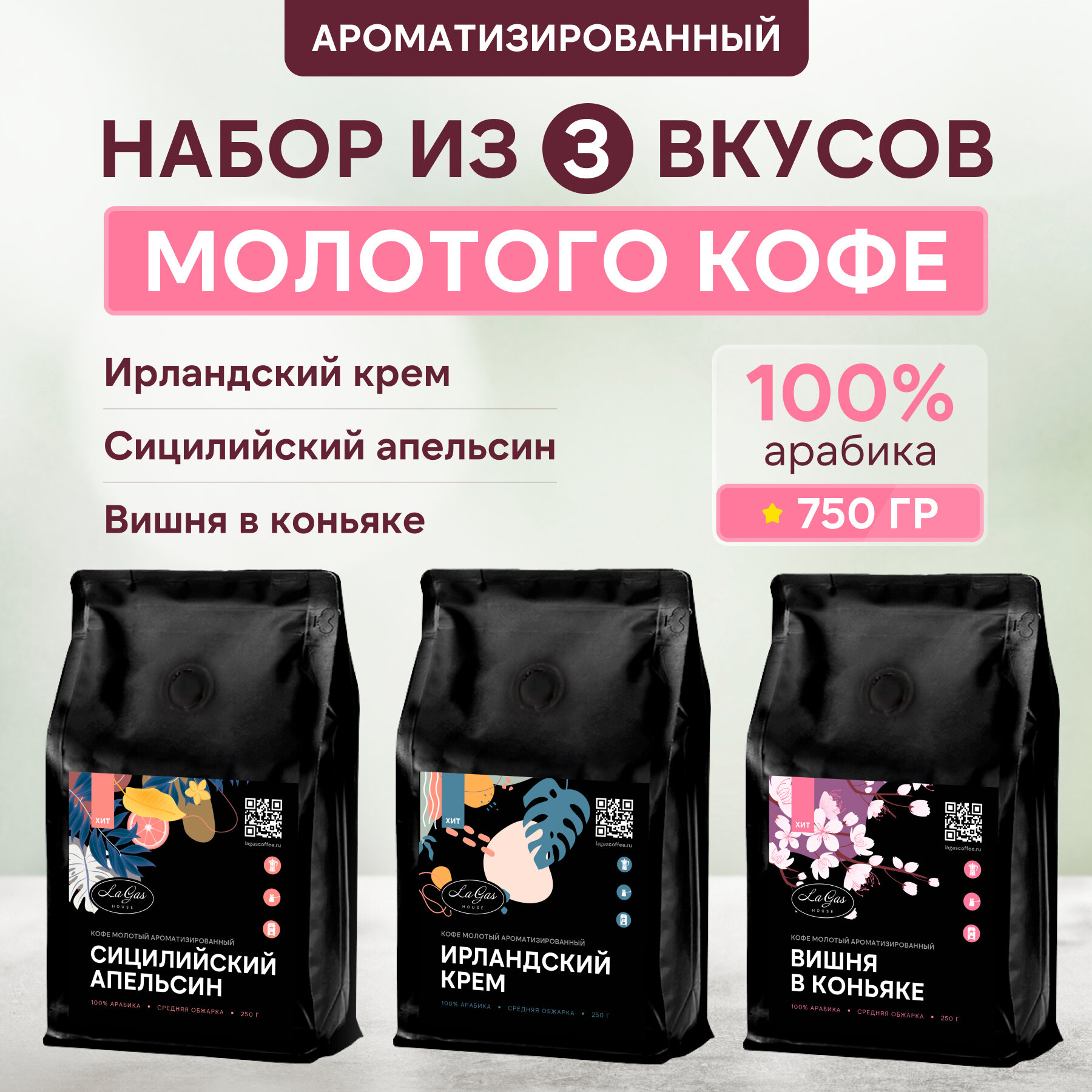 Купить Набор молотого кофе 3 шт по 250 гр Вишня в коньяке, Ирландский крем, Сицилийский апельсин 100% арабика, ароматизированный