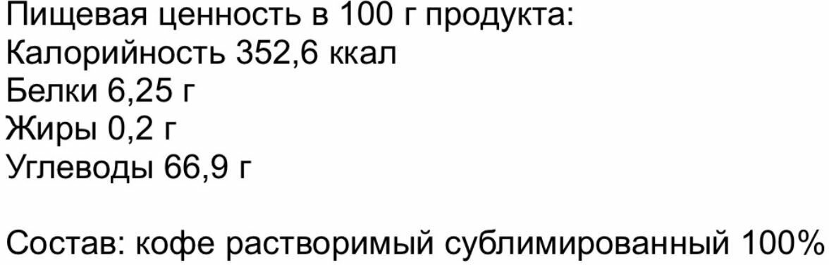 | Состав | 100% натуральный растворимый сублимированный кофе |