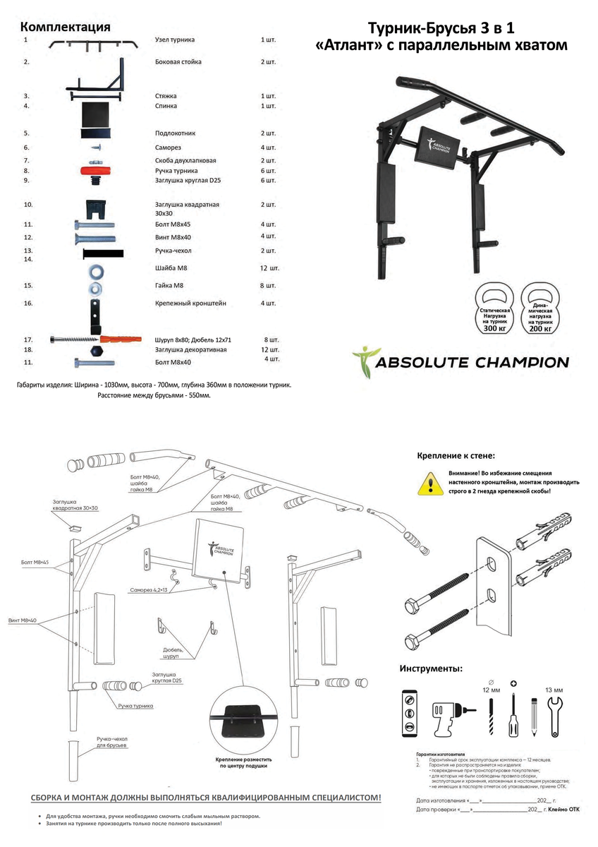 | Тип | 3в1: турник / брусья / пресс |