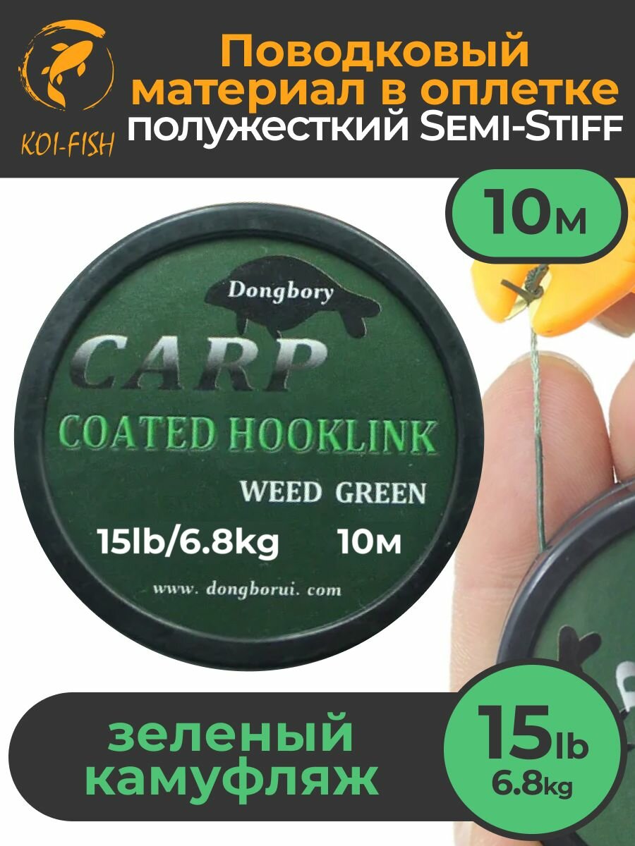 Поводковый материал в оболочке Semi-Stiff (полужёсткий) 15LB (6.8кг), 10м Зелёный камуфляж WEEDY GREEN рыболовный / Поводок в оплётке для ловли карпа