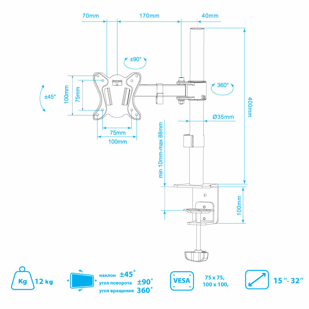 | Отзыв: | Монитор 32' весом 8 кг - держит, согласно заявленным характеристикам. Всё пространство стола под монитором свободно, штатная подставка забыта, как страшный сон. Но на что-то тяжелее уже может не хватить "жёсткости". |