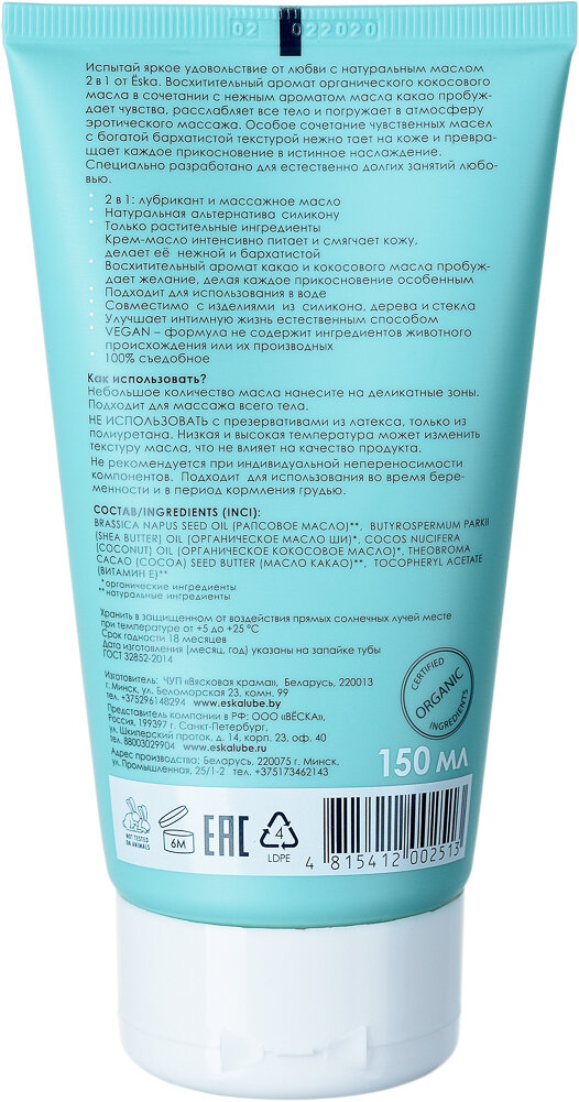 Ёska - массажное масло и лубрикант 2 в 1 на масляной основе 150 мл.