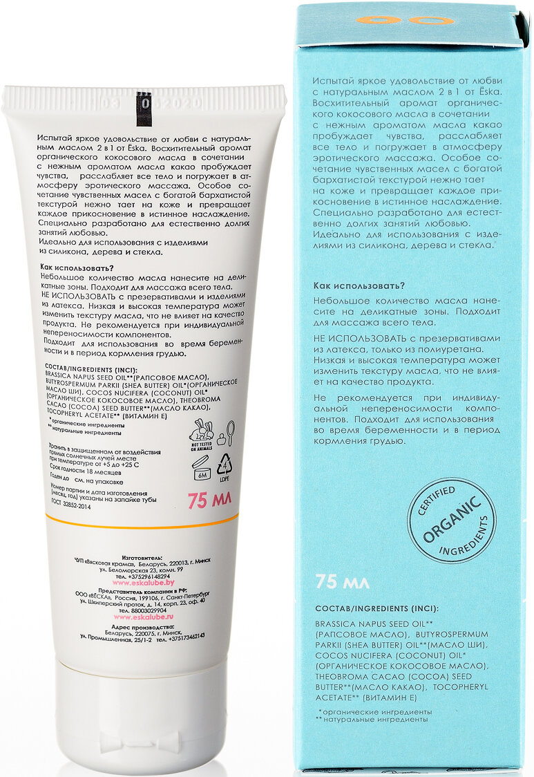 Натуральный лубрикант Ёska "2в1 на масляной основе" без вкуса, с ароматом какао и кокоса, для всех видов любви, 75мл.