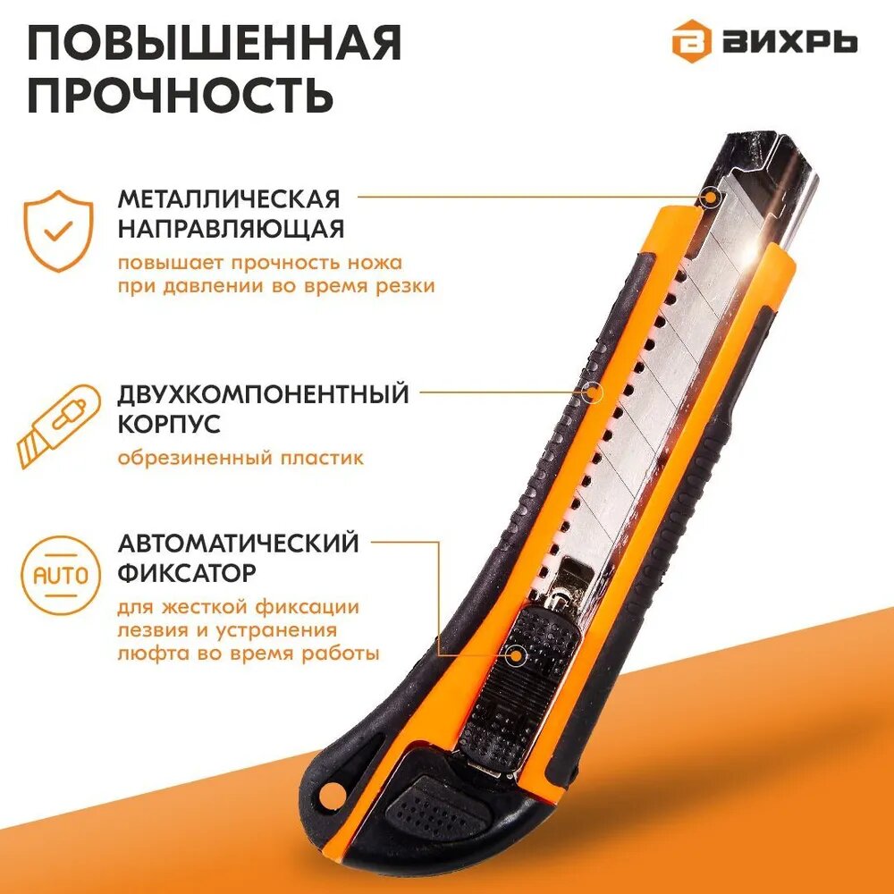 Нож с выдвижным лезвием 18 ммдвухкомпонентный корпусметаллическая направляющая автоматический фиксаторВихрь