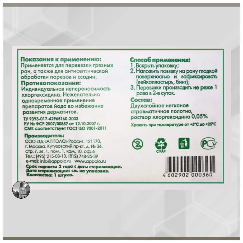 | Дополнительная информация | Повязка антимикробная с хлоргексидином размером 6х10 см |