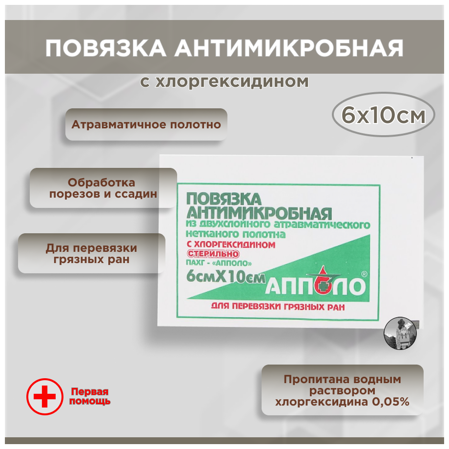 Повязка антимикробная с хлоргексидином 6х10см пахг-апполо для перевязки грязных ран. Комплект 10 шт.