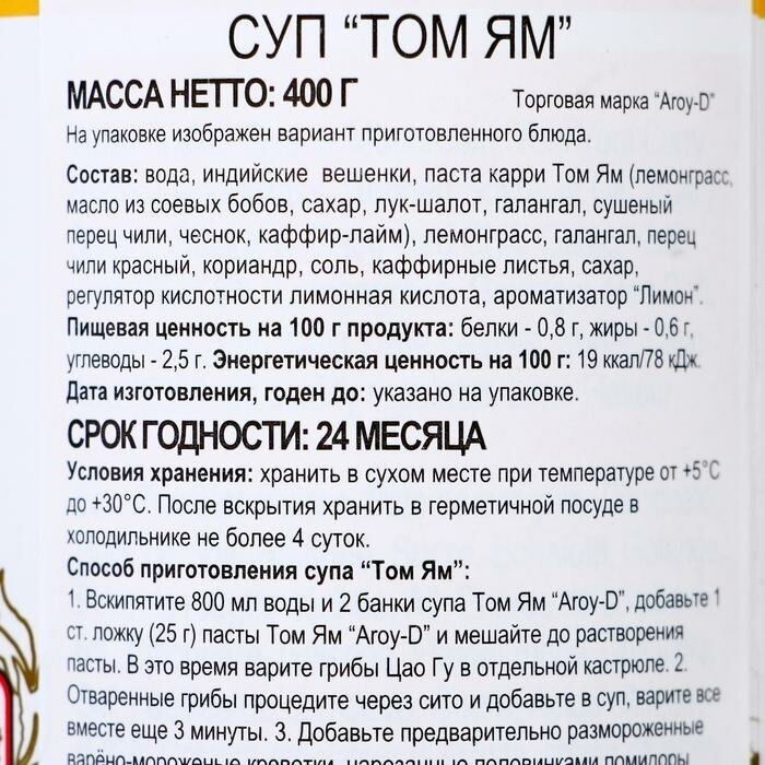 | Состав | вода, индийские вешенки, паста карри Том Ям (лемонграсс, масло из соевых бобов, сахар, лук шалот, галангал, сушеный перец чили, чеснок, каффир-лайм), лемонграсс, галангал, перец чили красный, кориандр, соль, каффирные листья, сахар, регулятор кислотности лимонная кислота, ароматизатор «Лимон» |