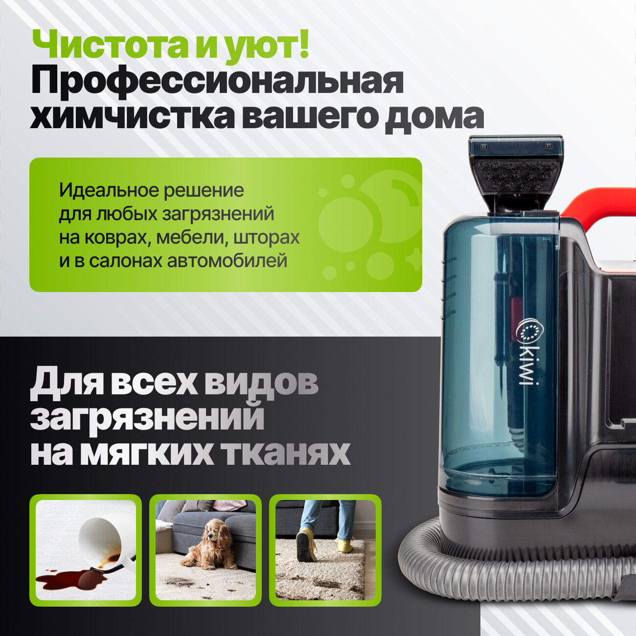 Моющий пылесос KIWI KCC-4320 для химчистки ковров, мягкой мебели, салона авто, мягких игрушек, для всех видов загрязнений на мягких тканях