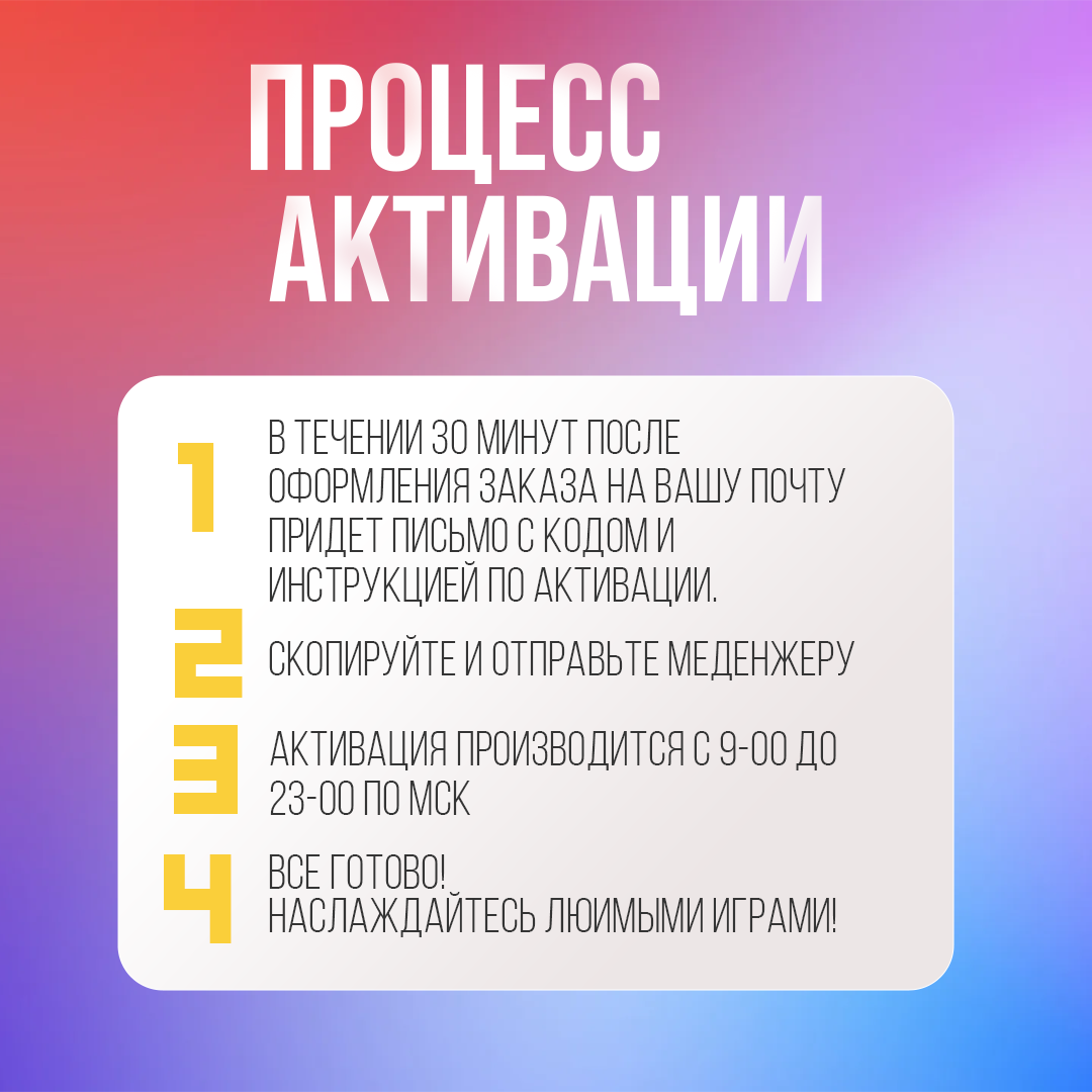 | Инструкция по активации | Вам на почту придет код, его нужно сообщить менеджеру в чат и мы вам все подключим в течении 15-30 минут |