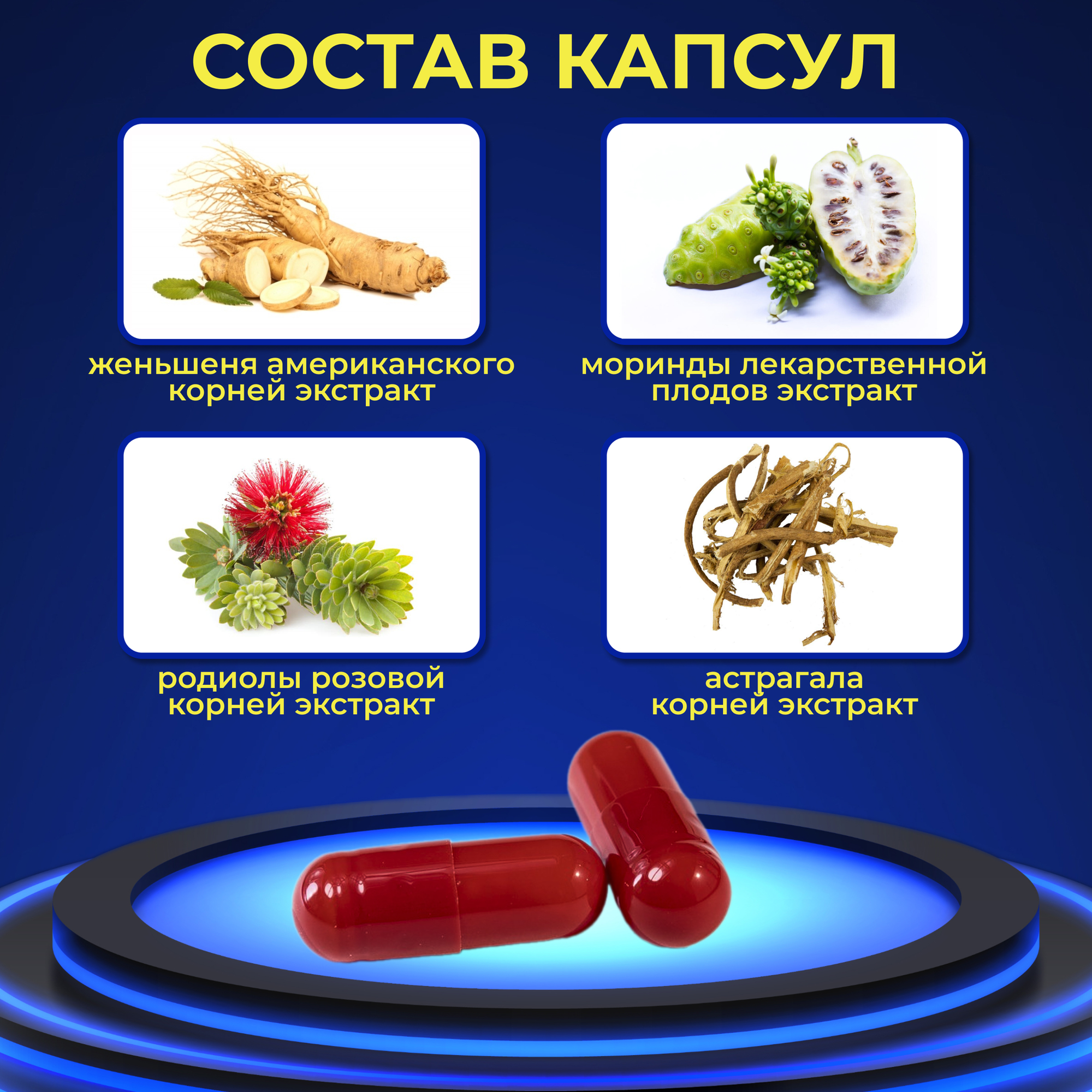 | Состав | Экстракт корней астрагала, экстракт плодов моринды лекарственной, экстракт корней родиолы розовой, экстракт корней женьшеня американского, магниевая соль стеариновой кислоты (Е470), оболочка капсулы (желатин, уксусная кислота (Е260), антоцианы (Е163). |