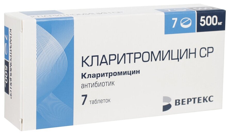 Ниже Вы можете прочитать отзывы на Кларитромицин СР-Вертекс, таблетки с пролонгированным высвобождением покрытые пленочной оболочкой 500 мг, 7 шт., ознакомится с подробными характеристиками, посмотреть интересные обзоры и фотографии на Кларитромицин СР-Вертекс, таблетки с пролонгированным высвобождением покрытые пленочной оболочкой 500 мг, 7 шт..