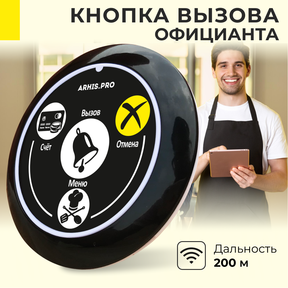 Кнопка вызова официанта персонала модель Смайл "Меню, Счет, Вызов, Отмена". Система вызова персонала ARHIS PRO интересное: