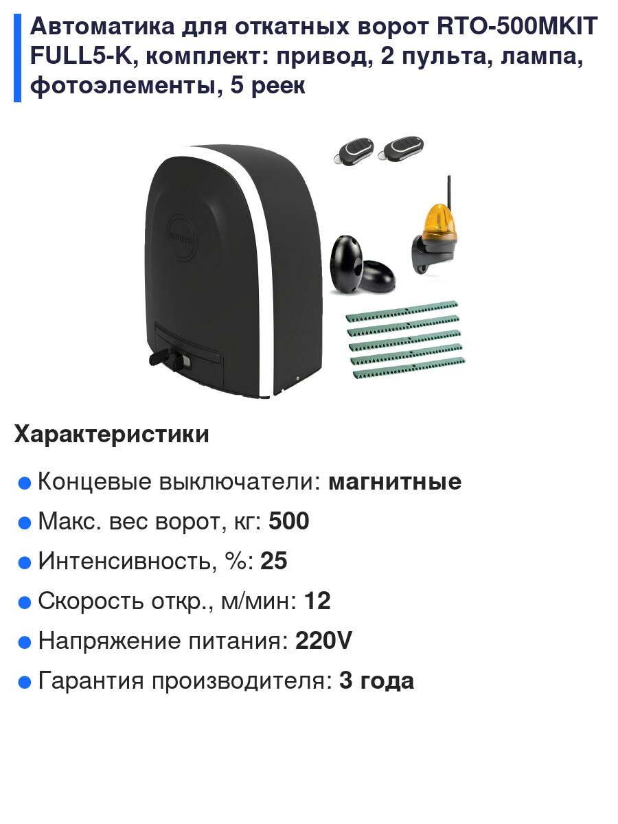 Автоматика для откатных ворот RTO-500MKIT FULL5-K, комплект: привод, 2 пульта, лампа, фотоэлементы, 5 реек интересное: