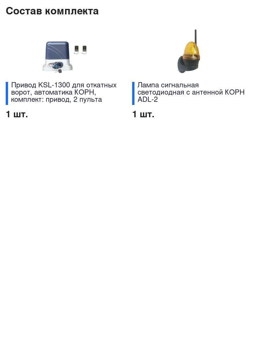 | Подробная комплектация | Привод KSL-1300 для откатных ворот, автоматика КОРН, комплект: привод, 2 пульта - 1 шт, Лампа сигнальная светодиодная с антенной ADL-2 - 1 шт. |