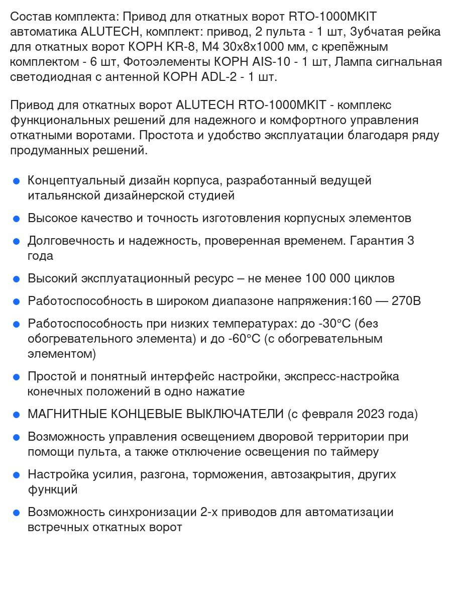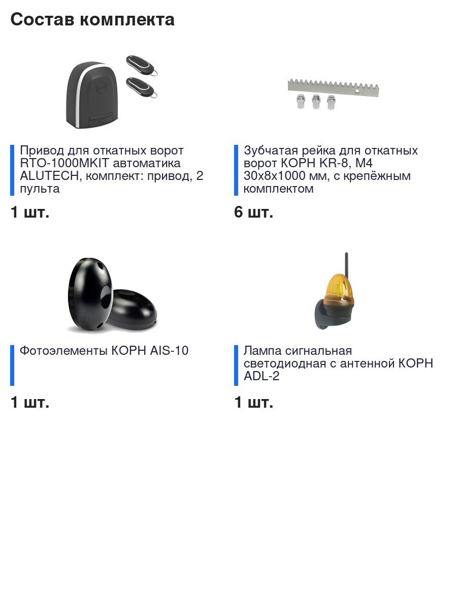 | Подробная комплектация | Привод для откатных ворот RTO-1000MKIT автоматика ALUTECH, комплект: привод, 2 пульта - 1 шт, Зубчатая рейка для откатных ворот KR-8, M4 30х8х1000 мм, с крепёжным комплектом - 6 шт, Лампа сигнальная светодиодная с антенной ADL-2 - 1 шт, Фотоэлементы AIS-10 - 1 шт. |