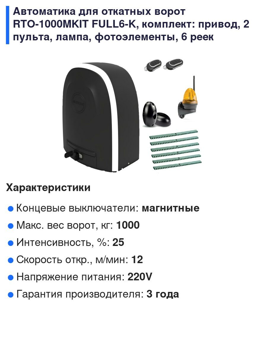Автоматика для откатных ворот RTO-1000MKIT FULL6-K, комплект: привод, 2 пульта, лампа, фотоэлементы, 6 реек интересное: