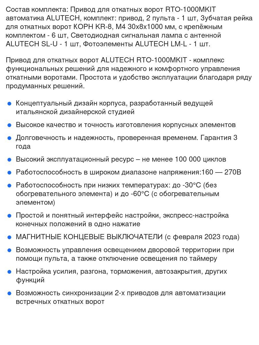 Автоматика для откатных ворот ALUTECH RTO-1000MKIT FULL6-BT, комплект: привод, 2 пульта, Bluetooth-модуль, лампа, фотоэлементы, 6 реек