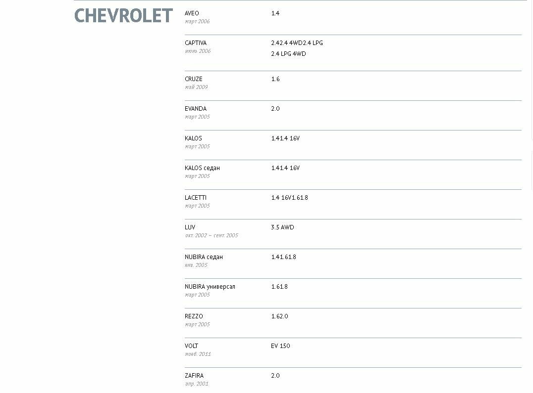 | Модель автомобиля | Chevrolet Aveo / Chevrolet Captiva / Chevrolet Cruze / Chevrolet Kalos / Chevrolet Lacetti / Chevrolet Lanos / Chevrolet Niva / Chevrolet Rezzo / Daewoo Espero / Daewoo Evanda / Daewoo Leganza / Daewoo Nexia / Daewoo Nubira / Fiat Croma / LADA 2121 / Lotus Europa S / Opel Antara / Opel Astra / Opel Astra H / Opel Combo / Opel Corsa / Opel Frontera / Opel Kadett / Opel Meriva / Opel Omega / Opel Rekord / Opel Signum / Opel Speedster / Opel Tigra / Opel Vectra / Opel Zafira / Saab 09-3x |