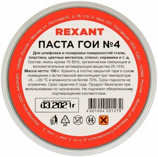 Купить Полировальная паста ГОИ № 4 REXANT для жесткой шлифовки и полировки поверхностей, банка 100 грамм