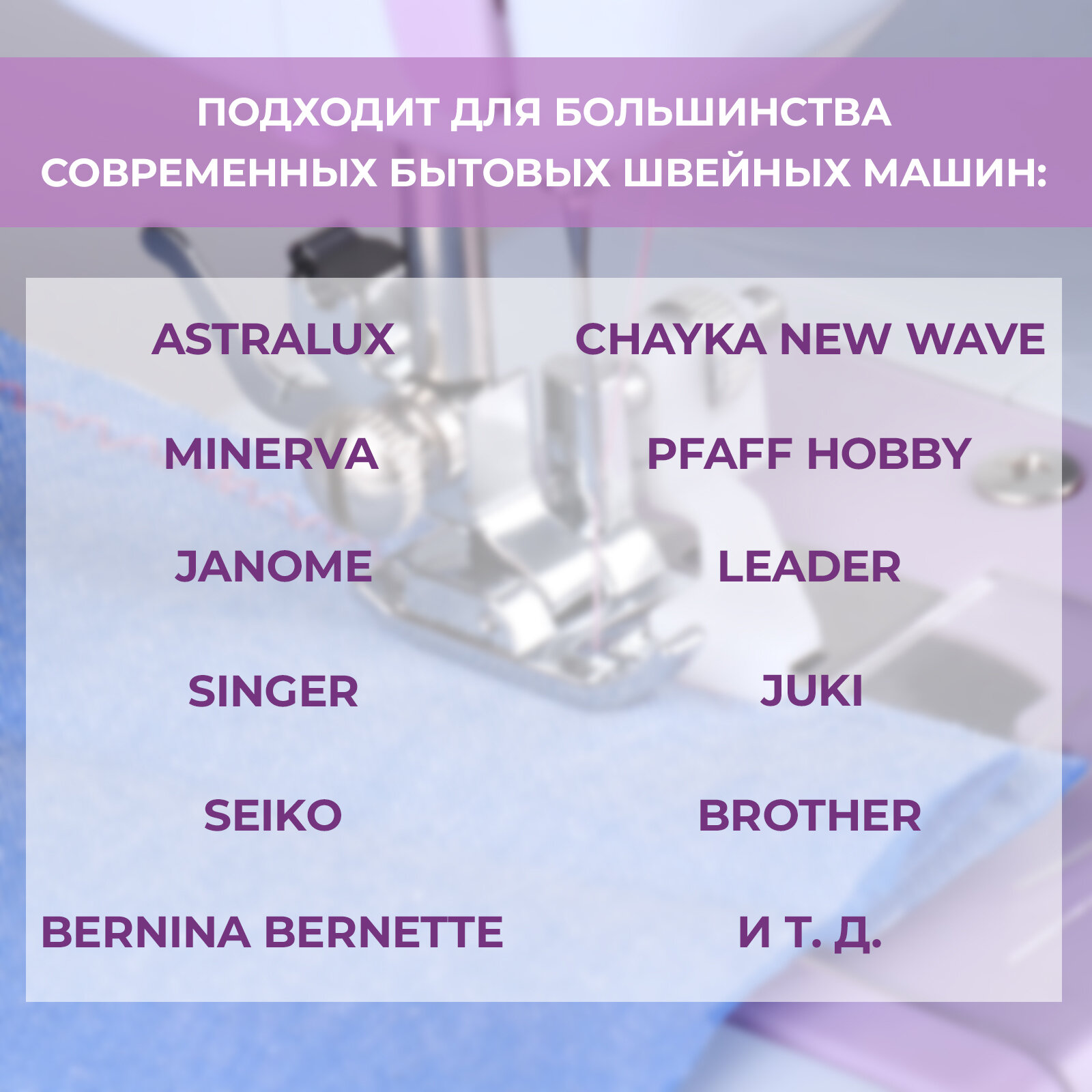| Совместимость | AstraLux, Minerva, Janome, Singer, Brother, Pfaff Hobby, Chayka New Wave, Bernina Bernette, Leader, JUKI, SEIKO |