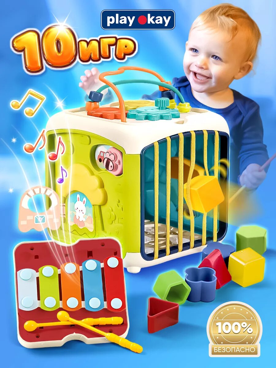 Сортер для малышей Play Okay геометрический куб головоломка, монтессори, раскладывается в доску, интеллектуальное развитие и положительные эмоции