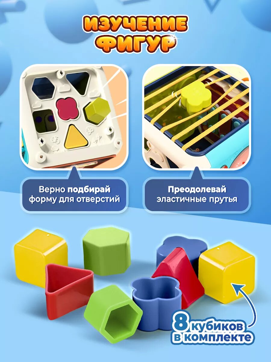 Сортер Куб по монтессори развивающий для малышей с резинками и геометрическими фигурами по цветам музыкальный