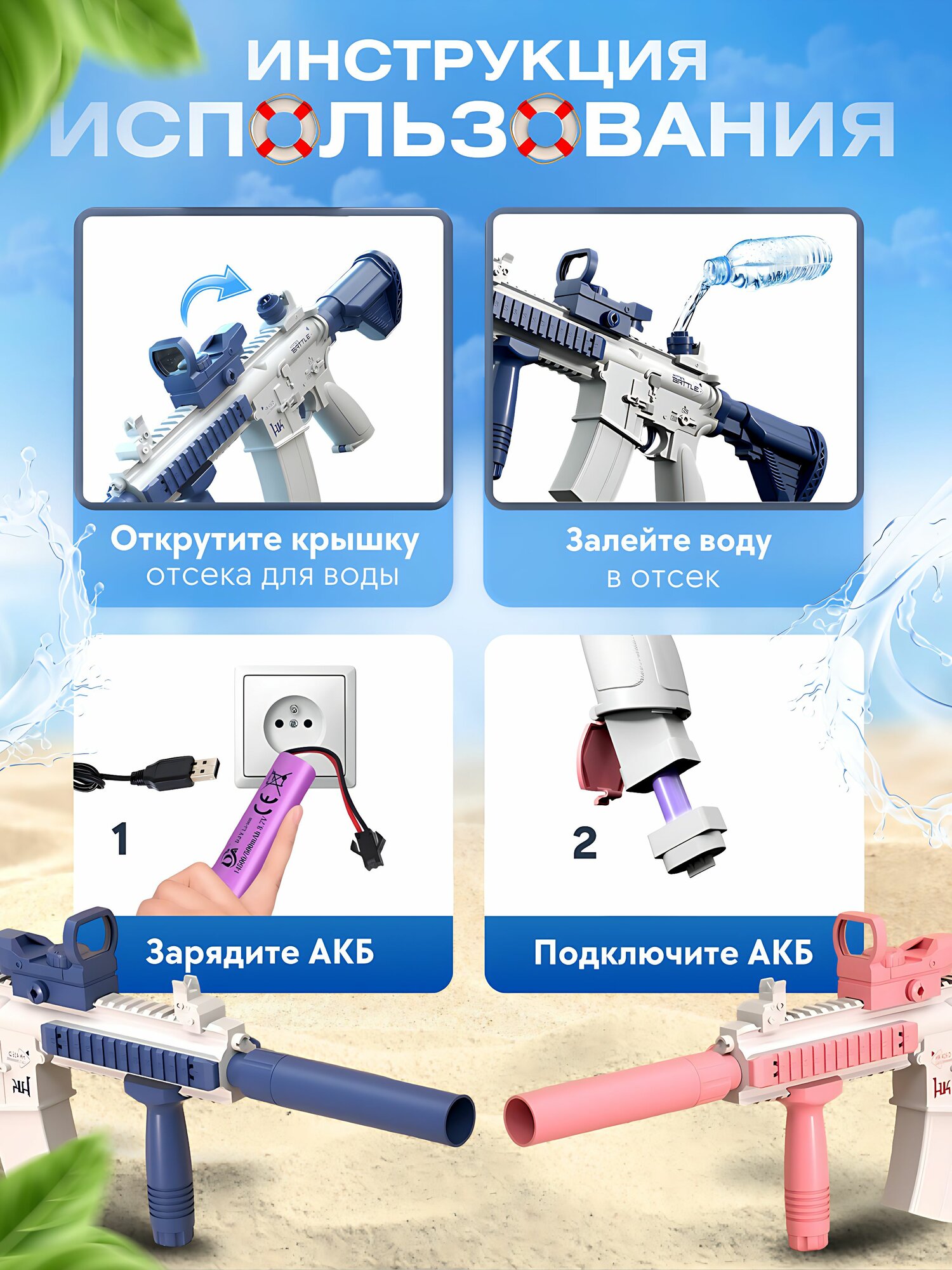 Автоматический водяной автомат М4 с аккумулятором для детей/ розовый интересное: