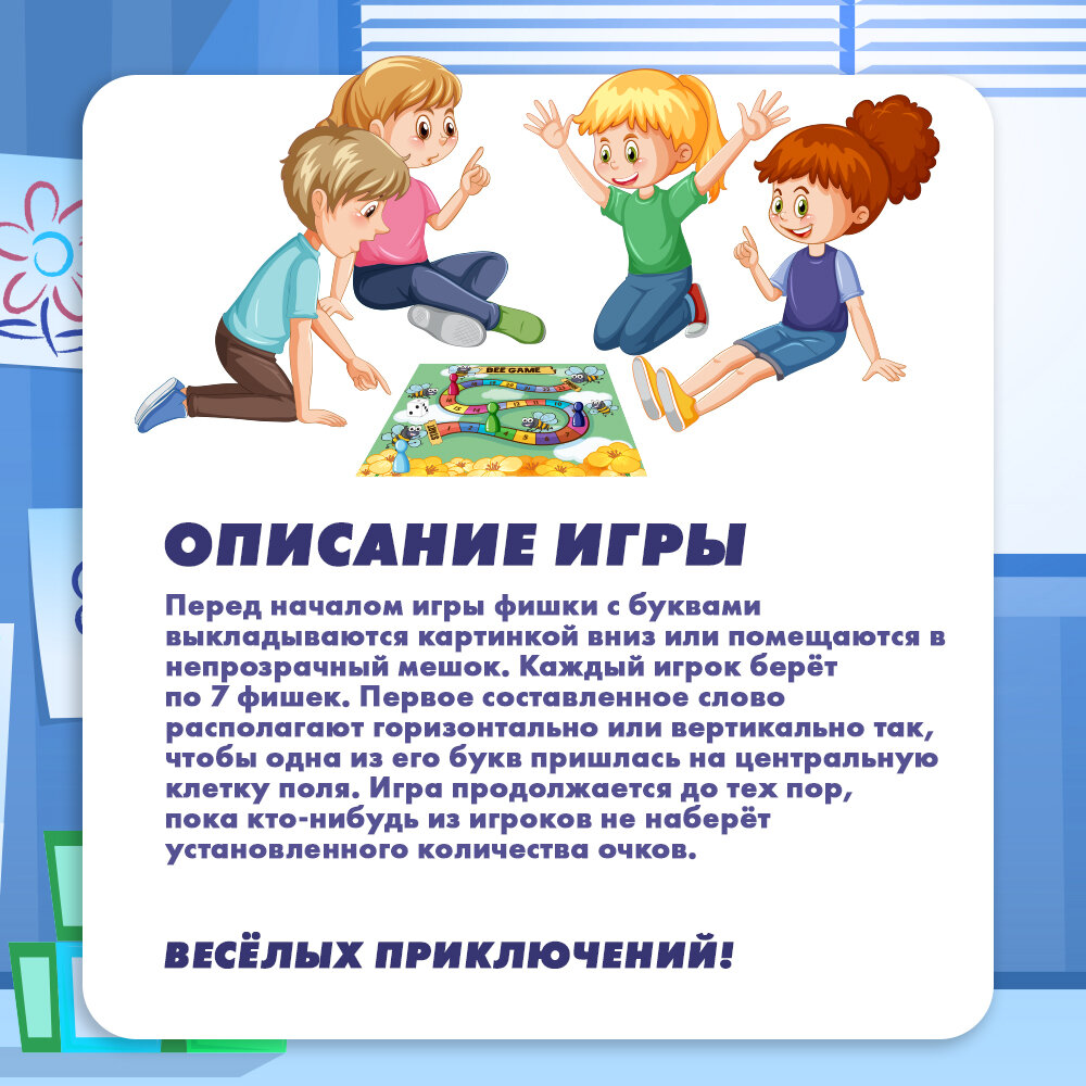 | Комплектация | коробка с игровым полем и инструкцией, 125 фишек (118 - с буквами, 3 джокера, 4 - запасные) |