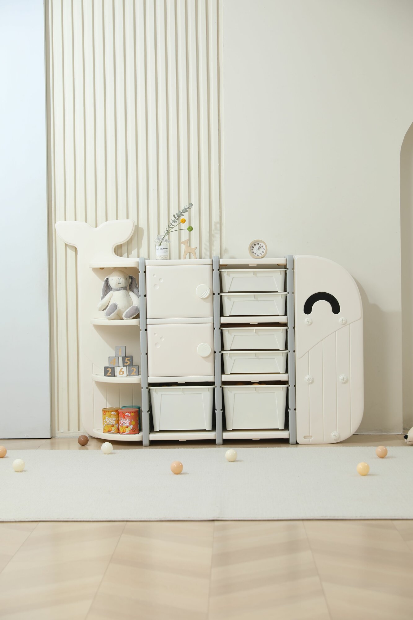 Стеллаж для игрушек UNIX Kids Whale White 5 ящиков + полки, напольный в детскую комнату, пластиковый, белый
