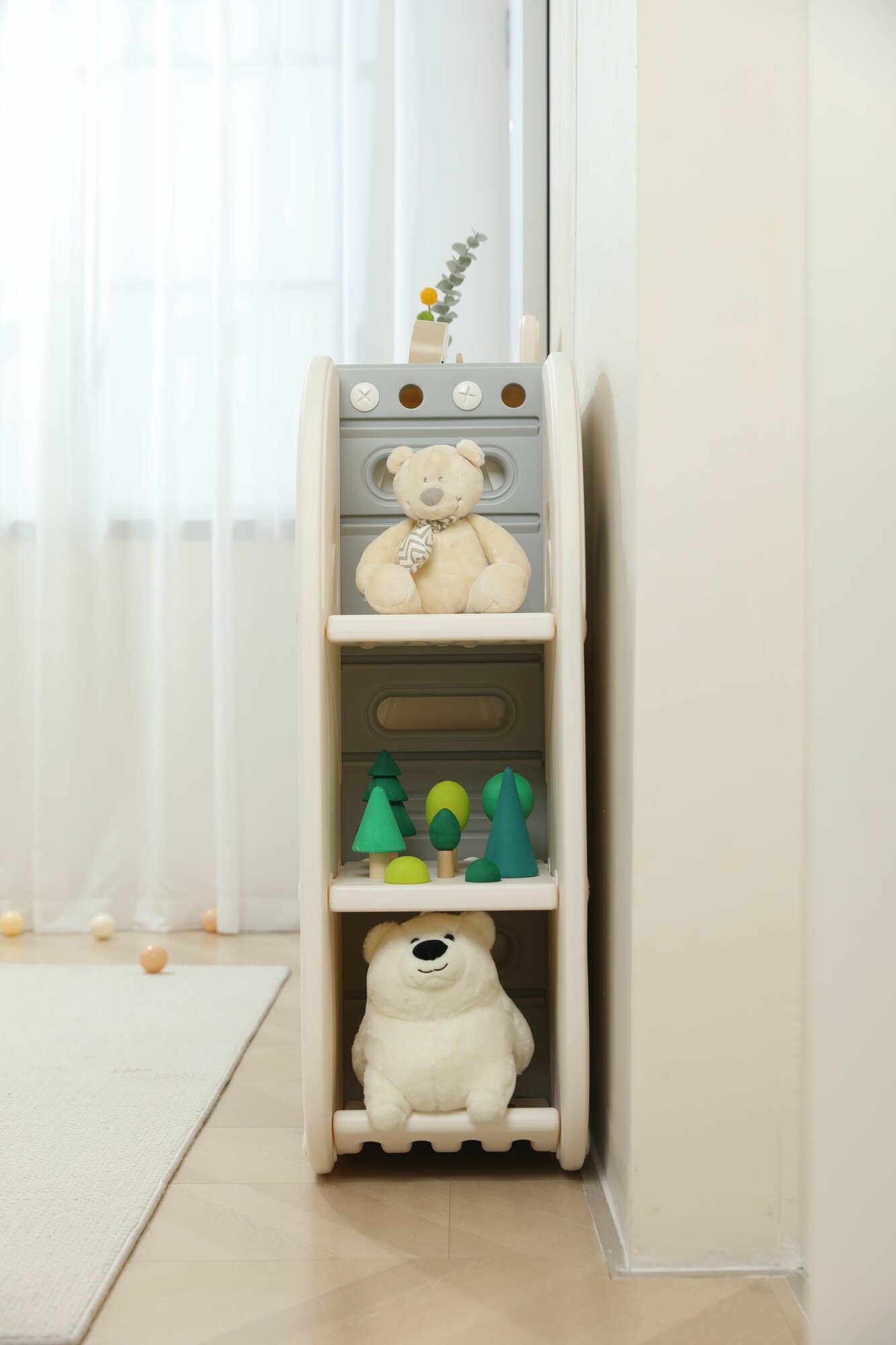 Стеллаж для игрушек UNIX Kids Cosmo 3 напольный на колесиках, с ящиками, пластиковый открытый стеллаж этажерка в детскую комнату для хранения, серый