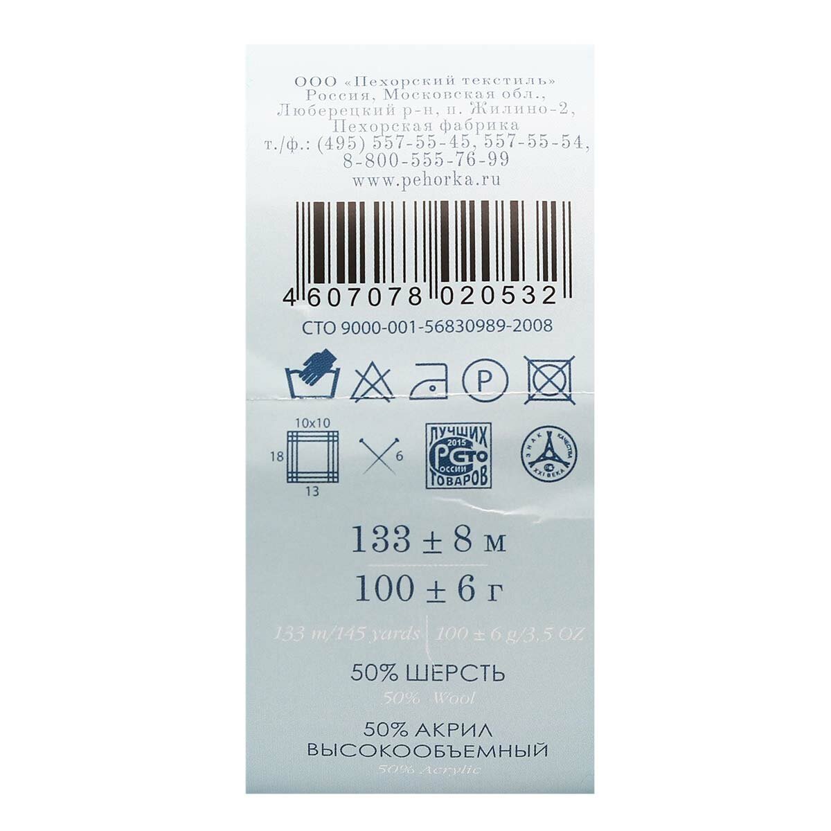 Пряжа для вязания Пехорка Популярная 073 айсберг 100 гр/133 м 50% шерсть, 50% акрил