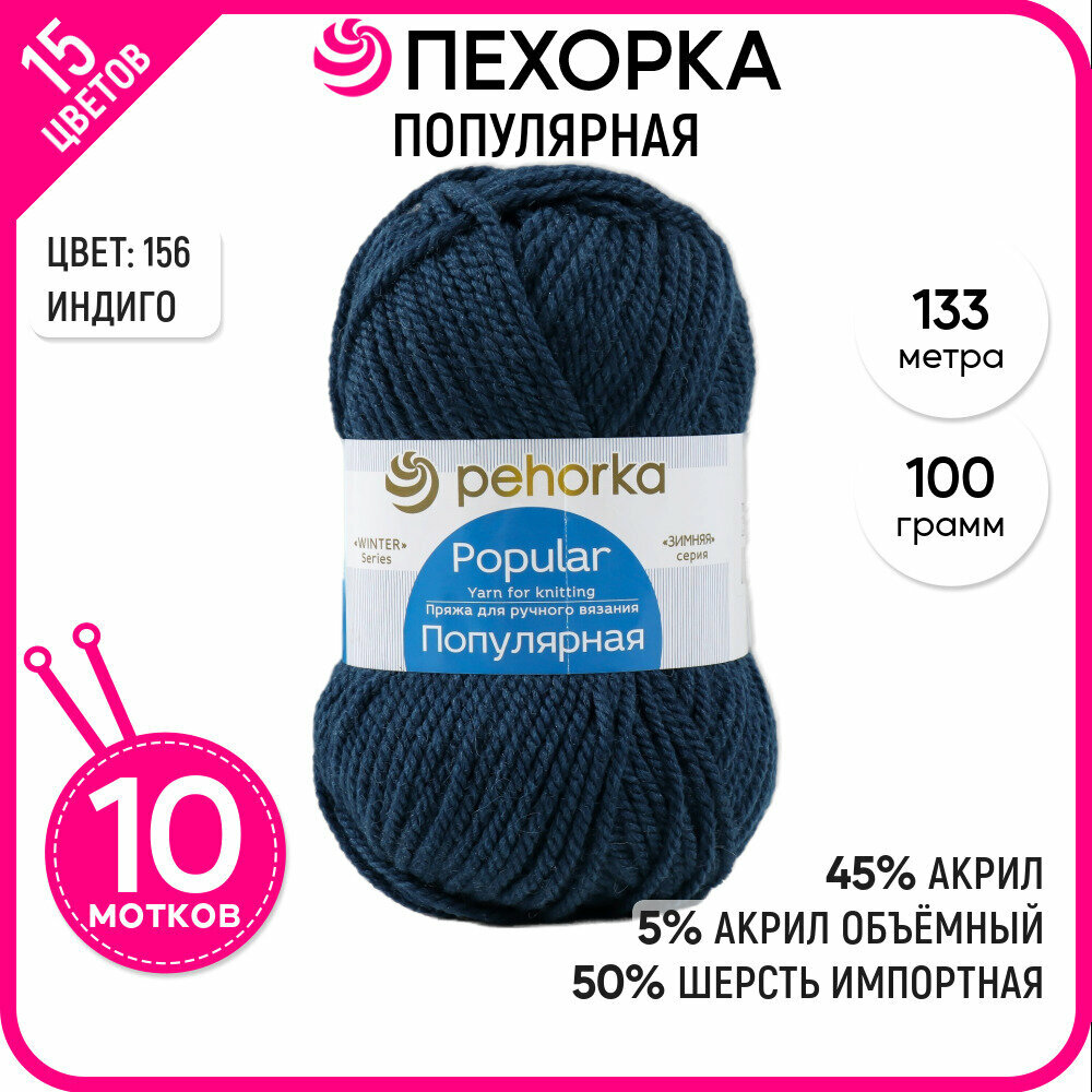Купить Пряжа для вязания Пехорка 'Популярная' 100г, 133м (50% шерсть, 50% акрил) (156-Индиго), 10 мотков