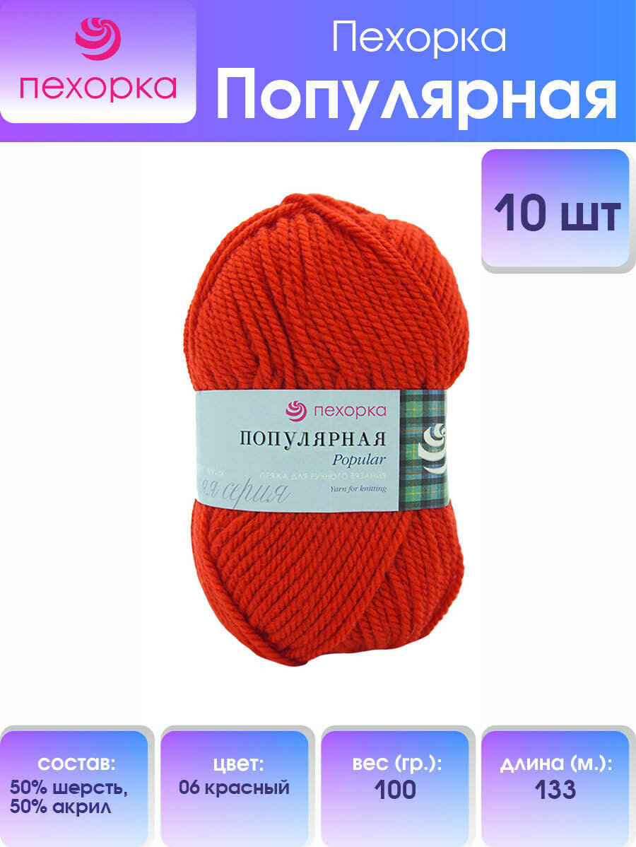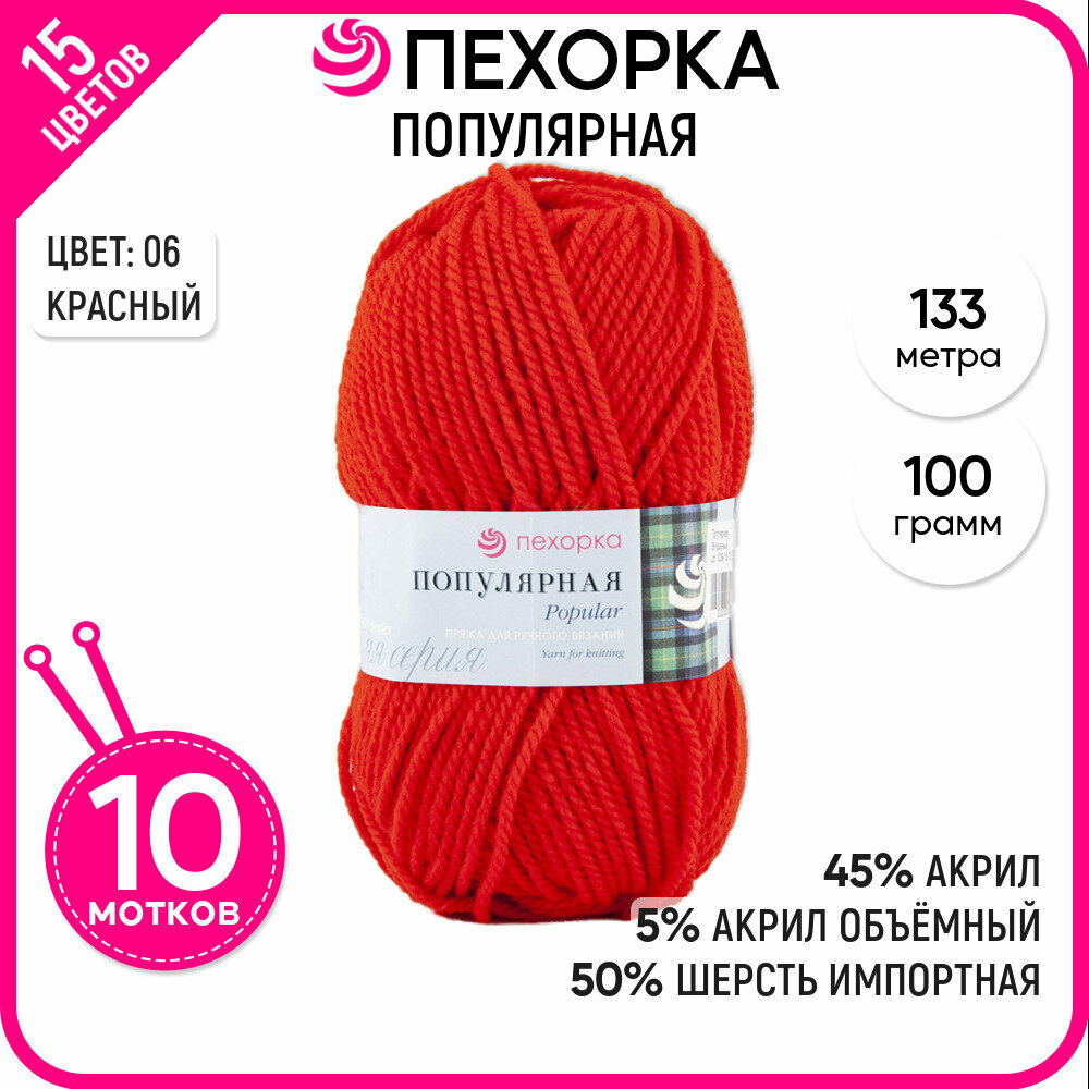Пряжа Популярная (Пехорка), Красный - 06, 50% шерсть, 45% акрил, 5% акрил высокообъёмный, 10 мотков, 100 г, 133 м.