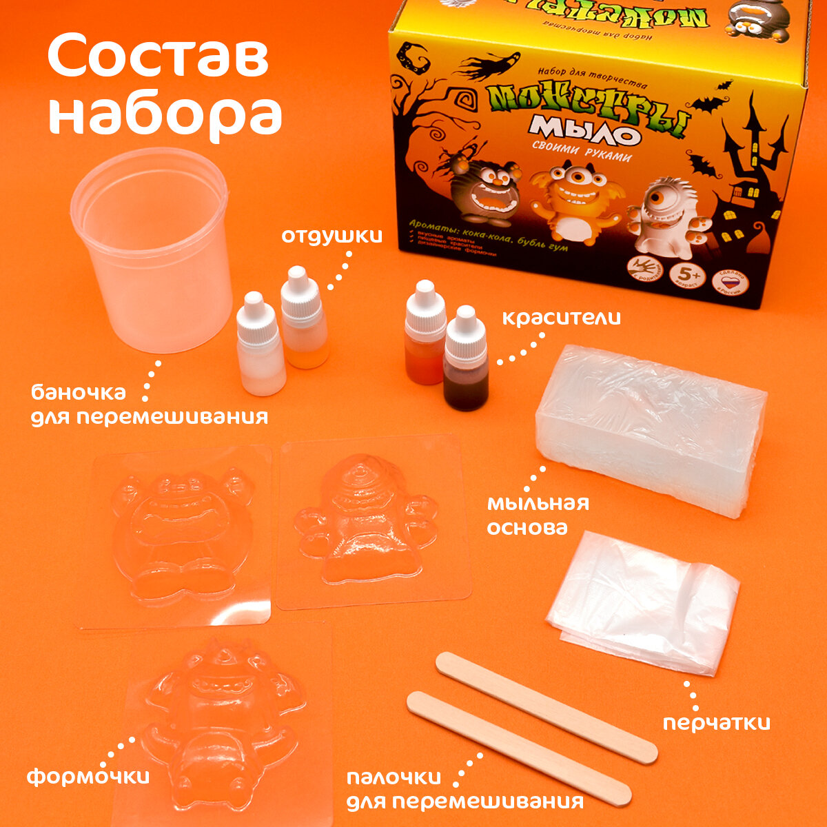 | В комплекте | ароматизатор, краситель, мыльная основа, формочка |