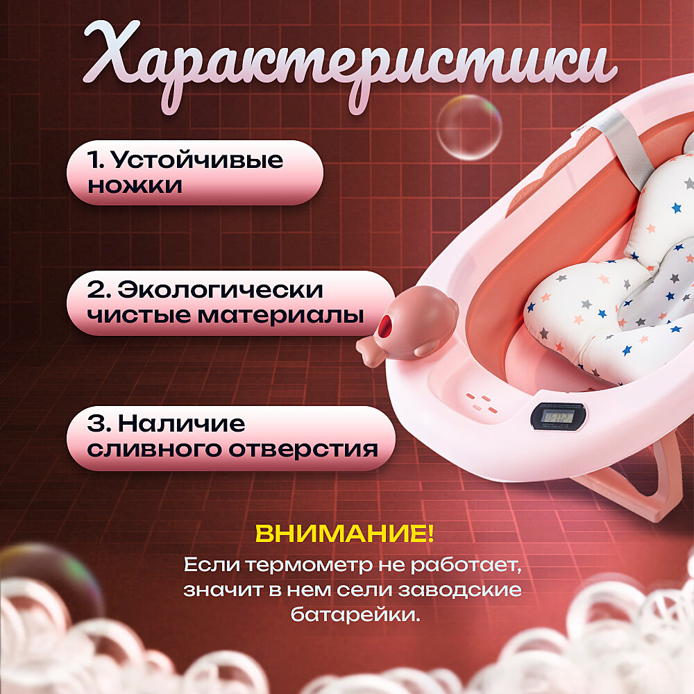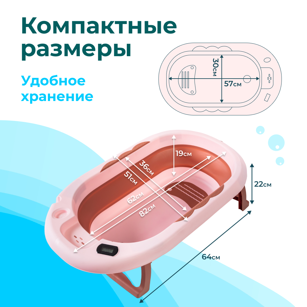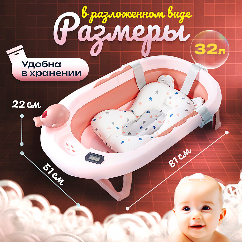 Ванночка для купания новорожденных складная с термометром, ковшиком и матрасом