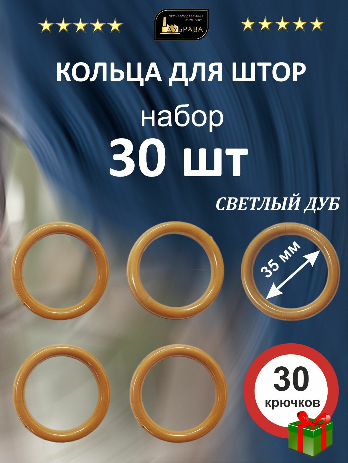 Кольца для штор " Дубрава" с крючками 35 мм Светлый дуб 30 шт
