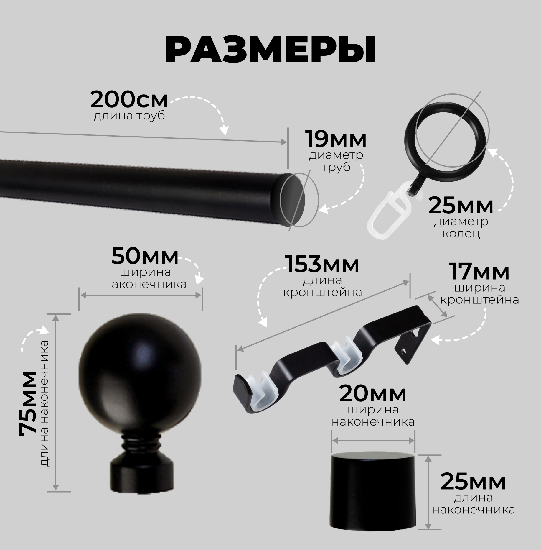 | Комплектация | Труба металлическая гладкая Ø19 мм - 2шт; Наконечники металлические - 2 шт; Заглушка - 2 шт; Кронштейны металлические; Кольца пластиковые + крючки; Комплект крепежа (дюбеля, шурупы). |