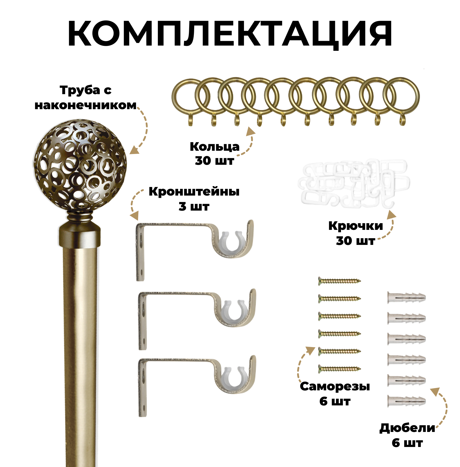 | Комплектация | Труба металлическая гладкая Ø16мм - 1шт; Наконечники металлические - 2 шт; Кронштейны металлические; Кольца пластиковые + крючки; Комплект крепежа (дюбеля, шурупы). |