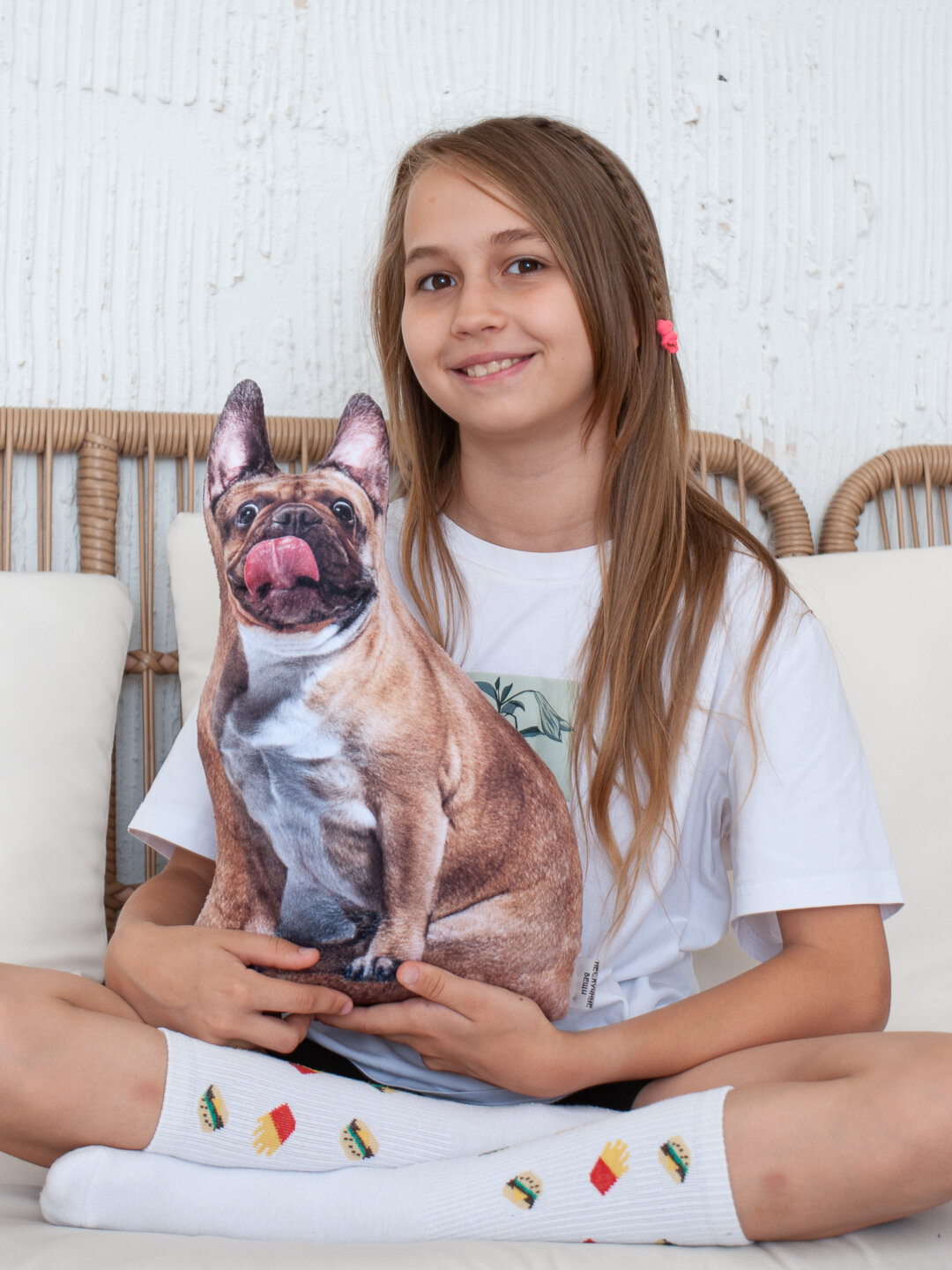 СохранитьРеалистичная мягкая интерьерная подушка-игрушка на диван собака Бульдог от бренда Нескучные вещи интересное: