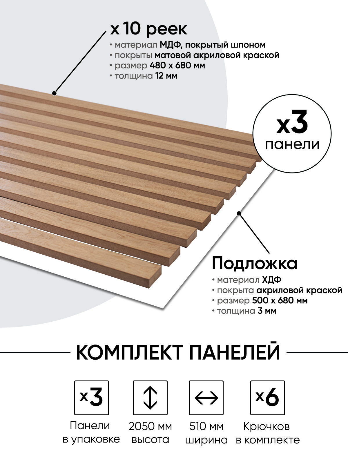 | Состав комплекта | Стеновые панели 3 шт / металлические крючки 6 шт / крепеж / инструкция |