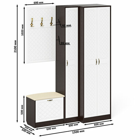 | Габариты | габариты (ШхГхВ): набора - 150х50х210 см, шкафа - 60х50х210 см, пенала - 30х35х210 см, обувницы с сиденьем - 60х35х50 см, вешалки - 60х9,3(1,6)х102 см |