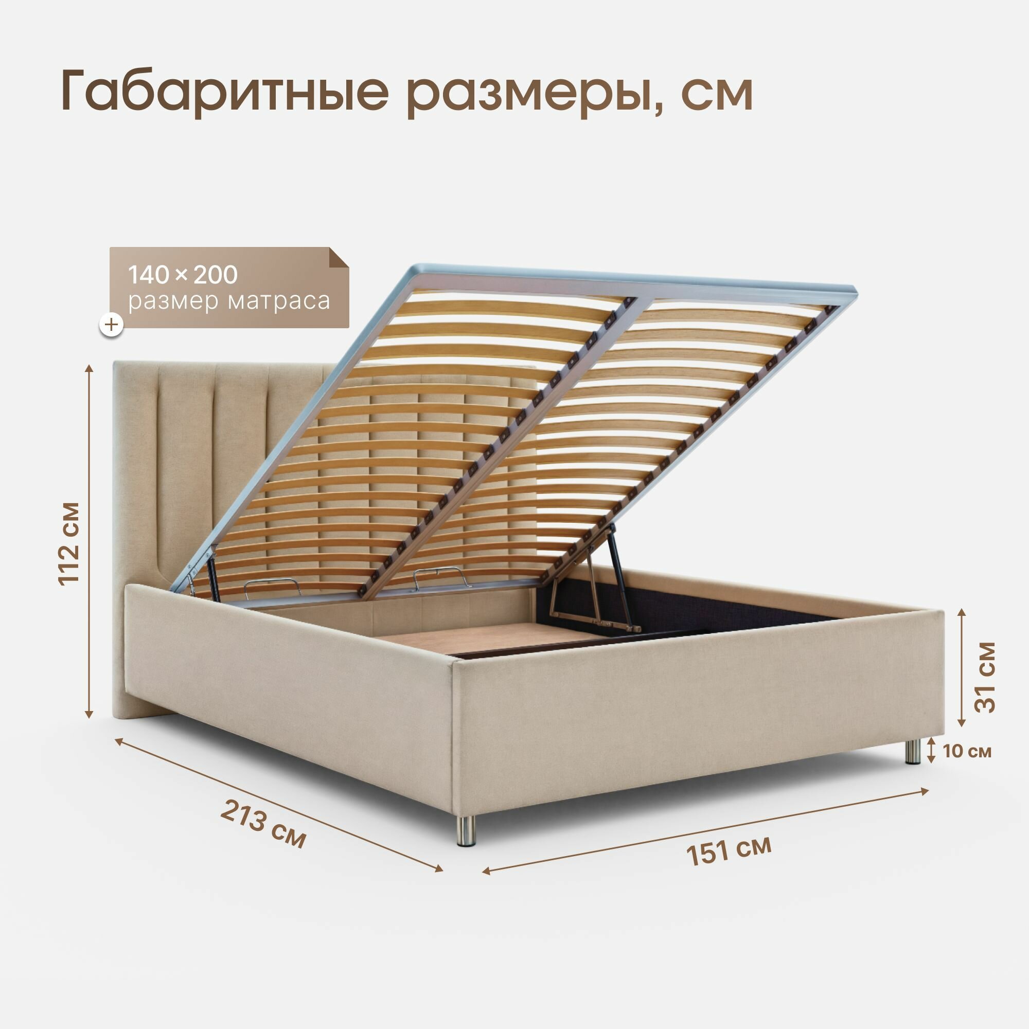 | Особенности | мягкое изголовье, основание под матрас, с изножьем, с подъемным механизмом, с ящиком для белья, усиленная конструкция |