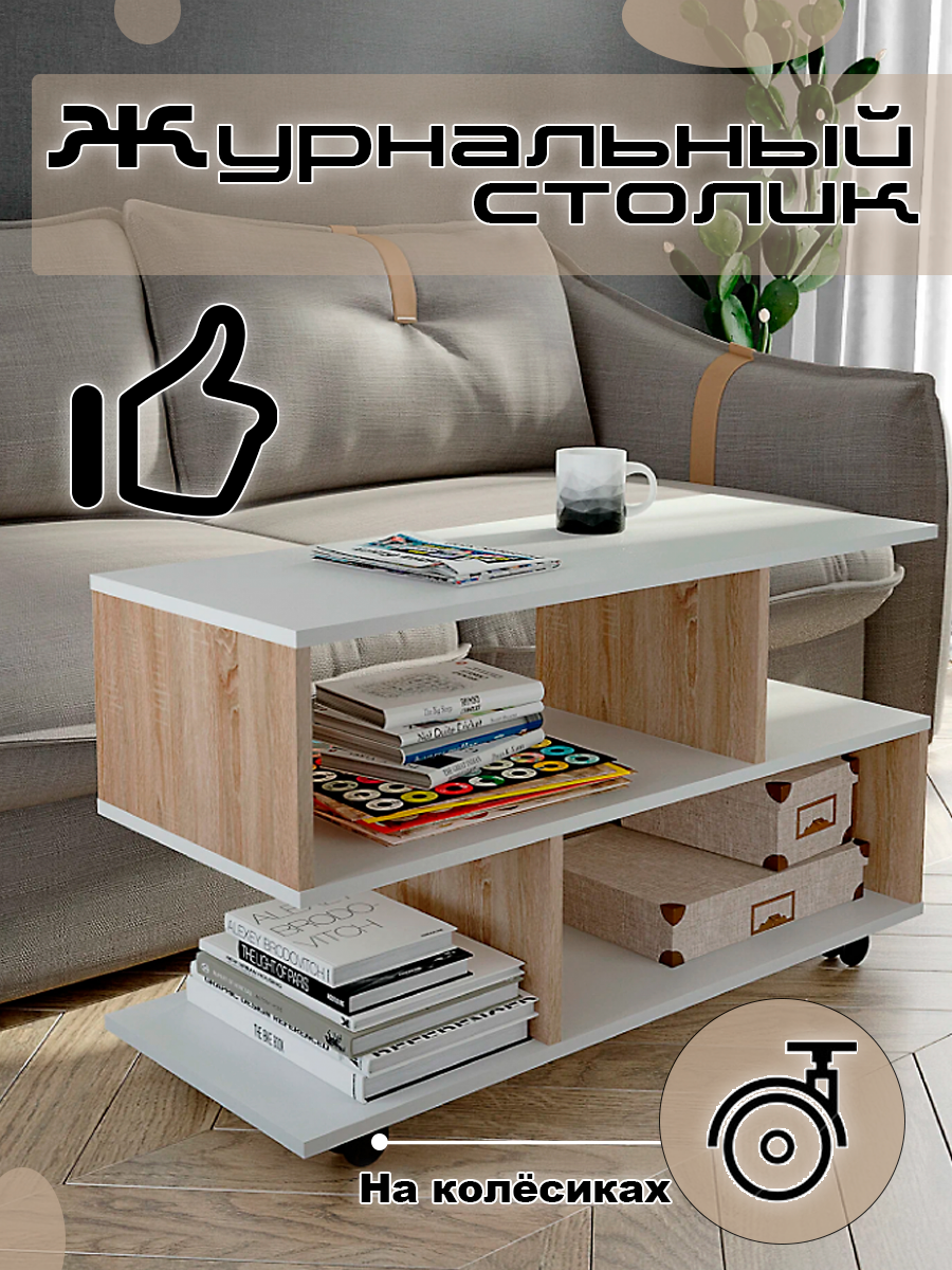 СохранитьСтолик журнальный на колесиках от бренда "Мебель от Прудникова", 70х30х62 см, белый и дуб сонома интересное: