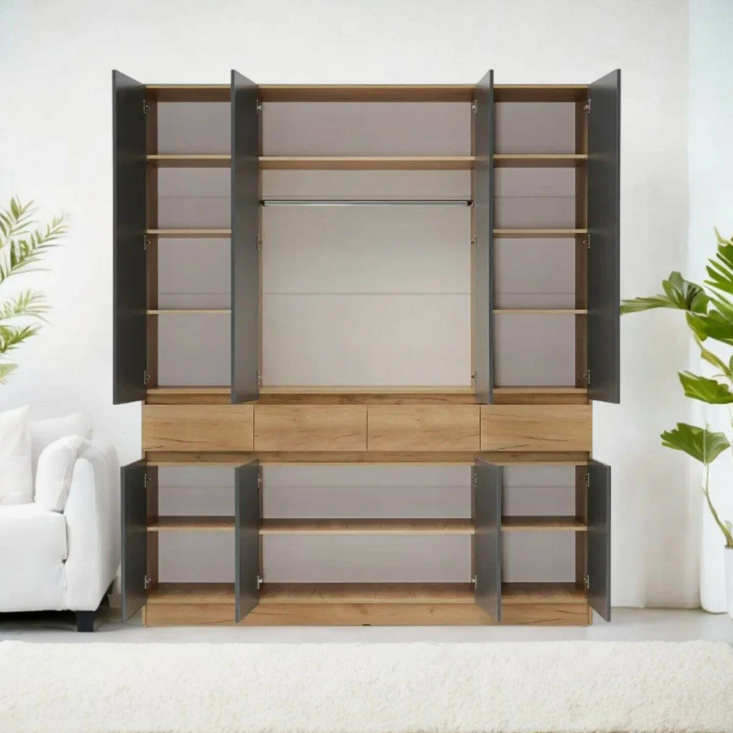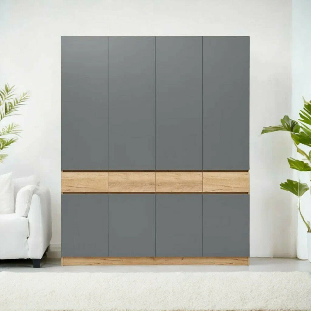 Шкаф Роджина для одежды 4-х створчатый с ящиками, Графит/Дуб Крафт Белый, 199.8x52x240 см