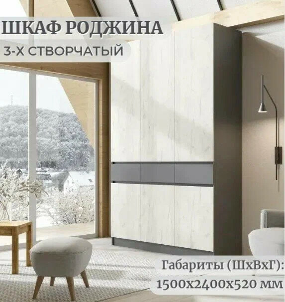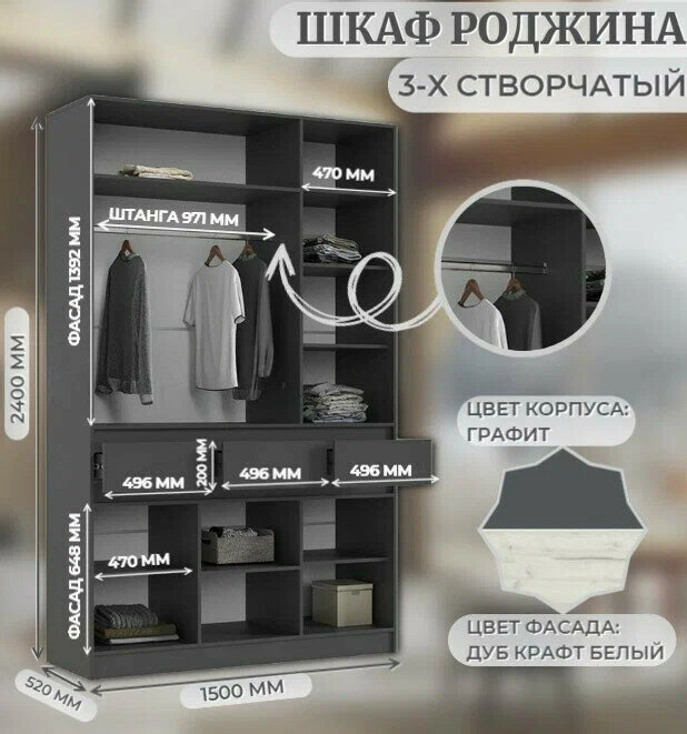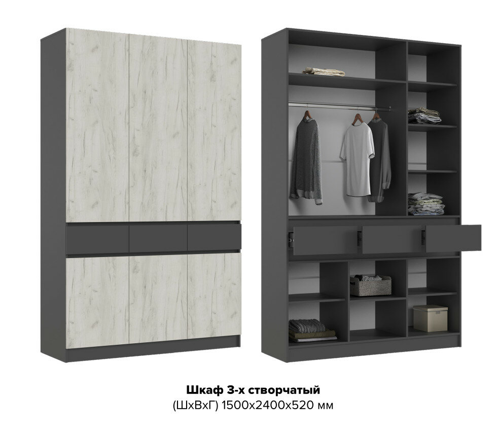 СохранитьВысокий шкаф с ящиками для одежды Миф Роджина трехстворчатый Графит/ Дуб крафт белый, размер ШхГхВ 1500х520х2400мм интересное:
