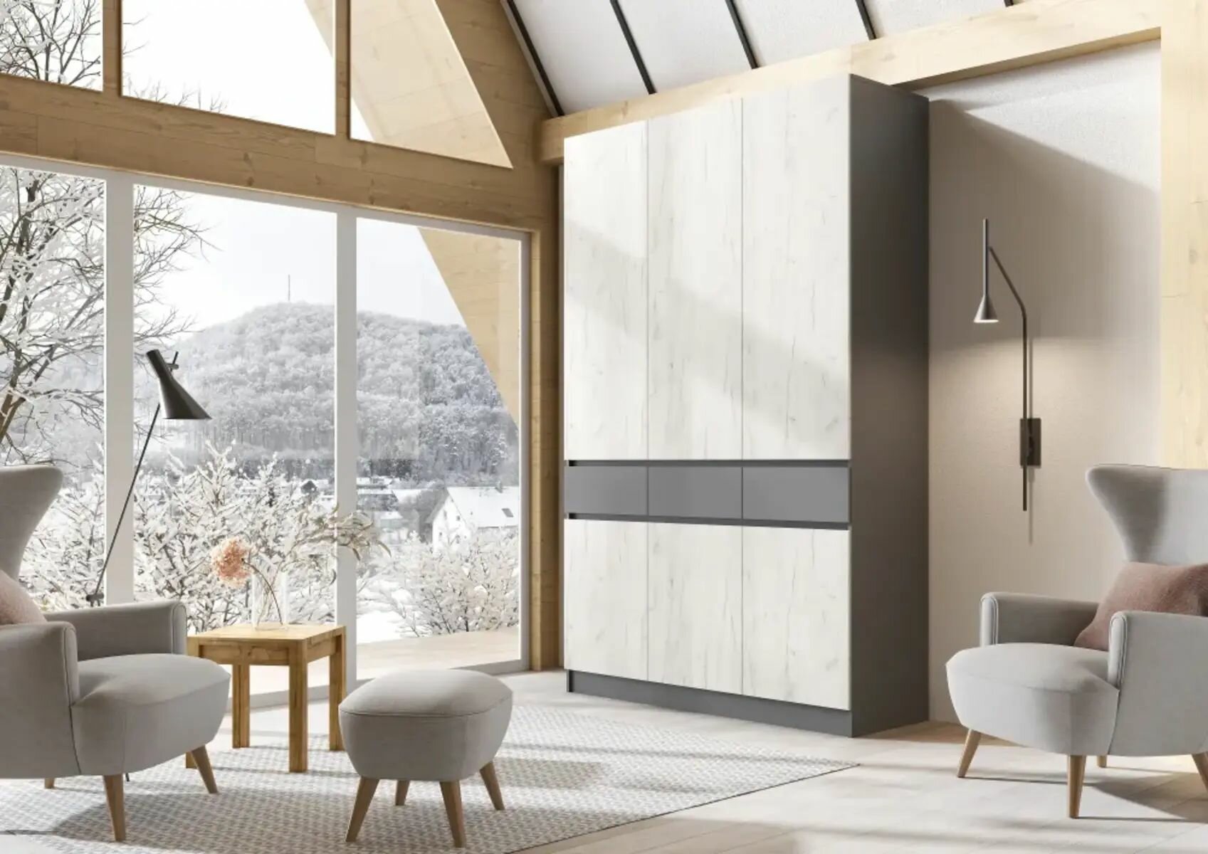 Шкаф распашной Роджина 4-створчатый с ящиками, ЛДСП "Графит, Дуб Крафт белый"