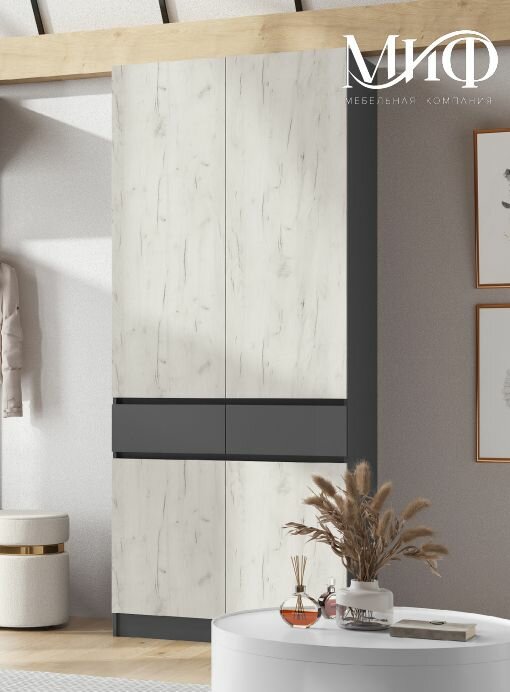 Шкаф распашной Роджина 4-створчатый с ящиками, ЛДСП "Графит, Дуб Крафт белый"