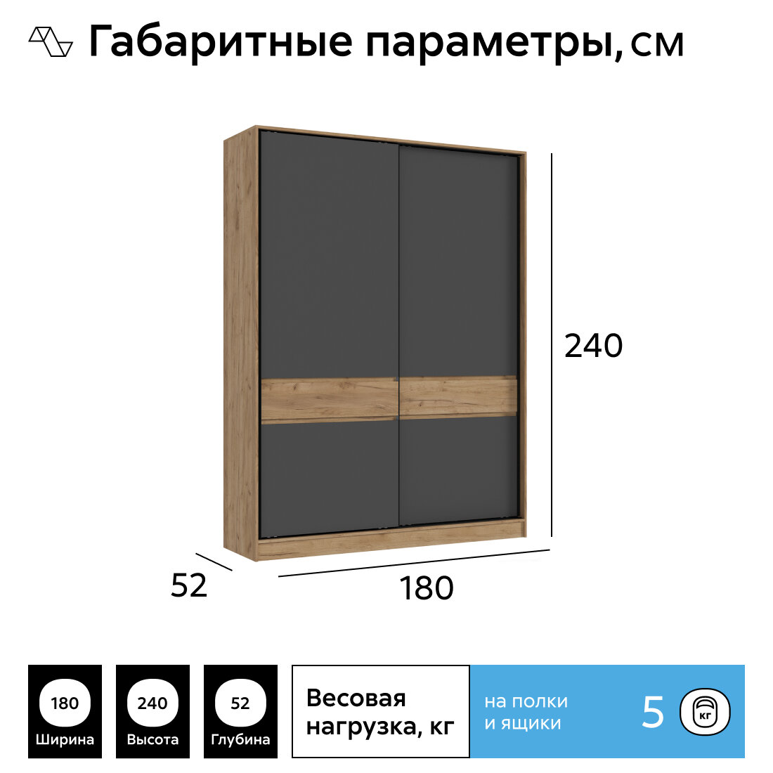 Купить Шкаф-купе для одежды Роджина, 240х52х180 см | Дуб крафт, Графит
