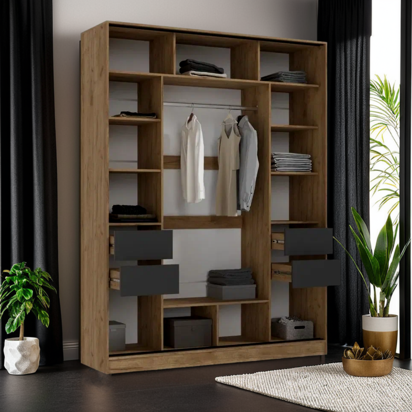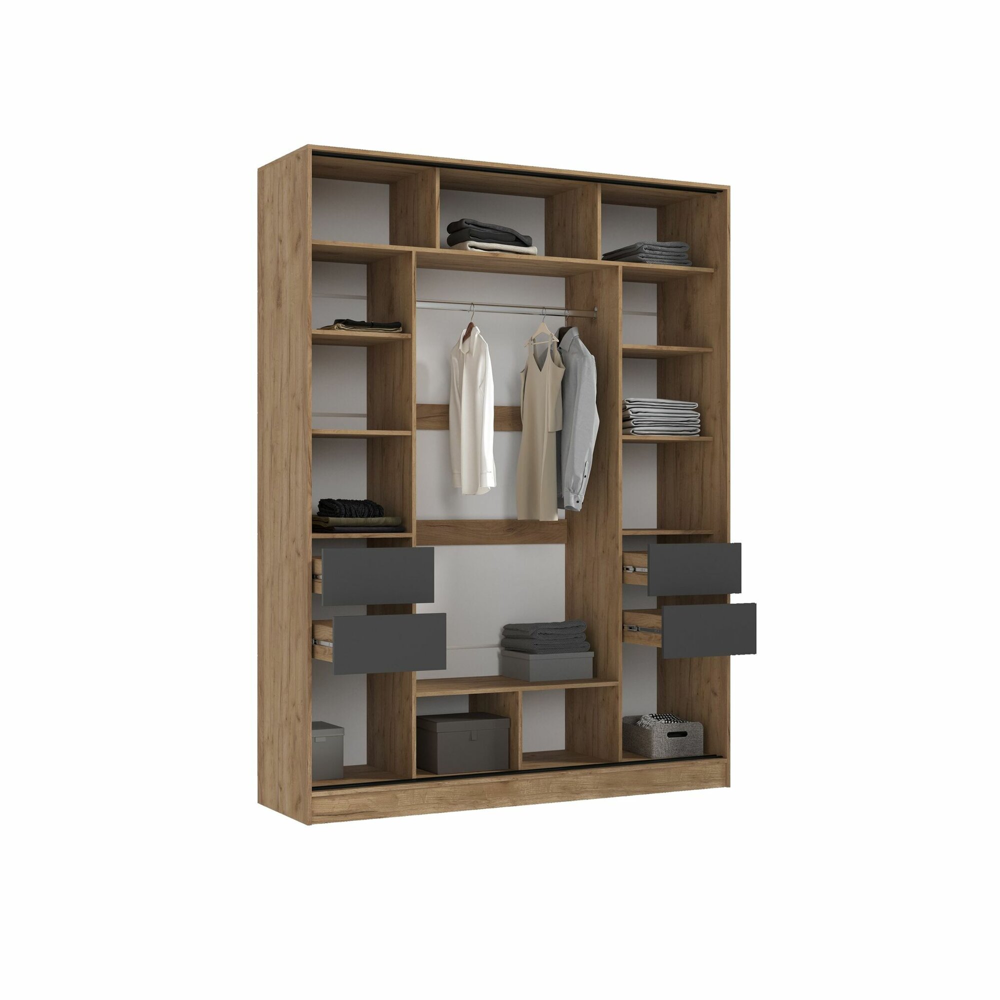 Шкаф Роджина для одежды 4-х створчатый с ящиками, Графит/Дуб Крафт Белый, 199.8x52x240 см