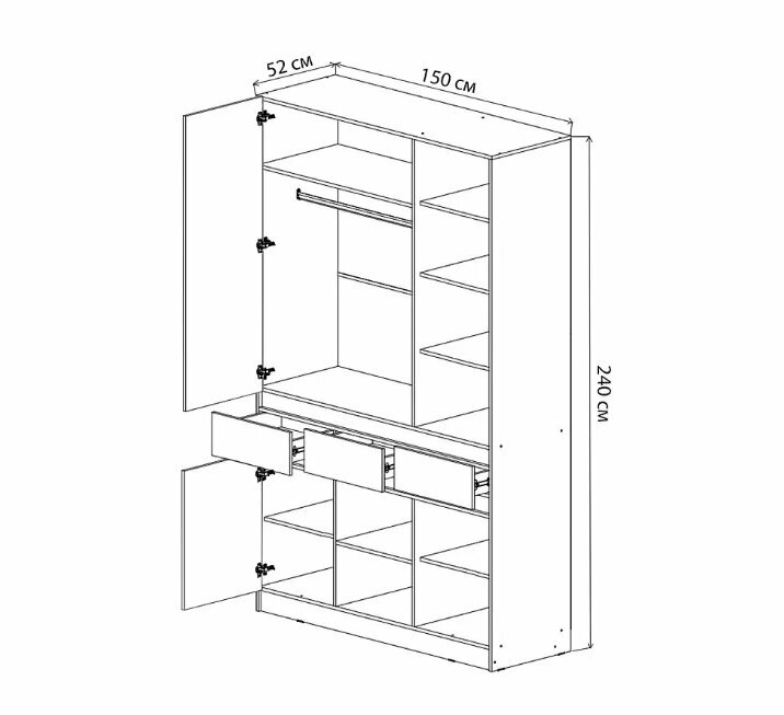 Шкаф распашной 3-х створчатый Роджина Дуб белый крафт, Графит/Шкаф трехстворчатый для одежды с ящиками, 150х240х52 см, ЛДСП